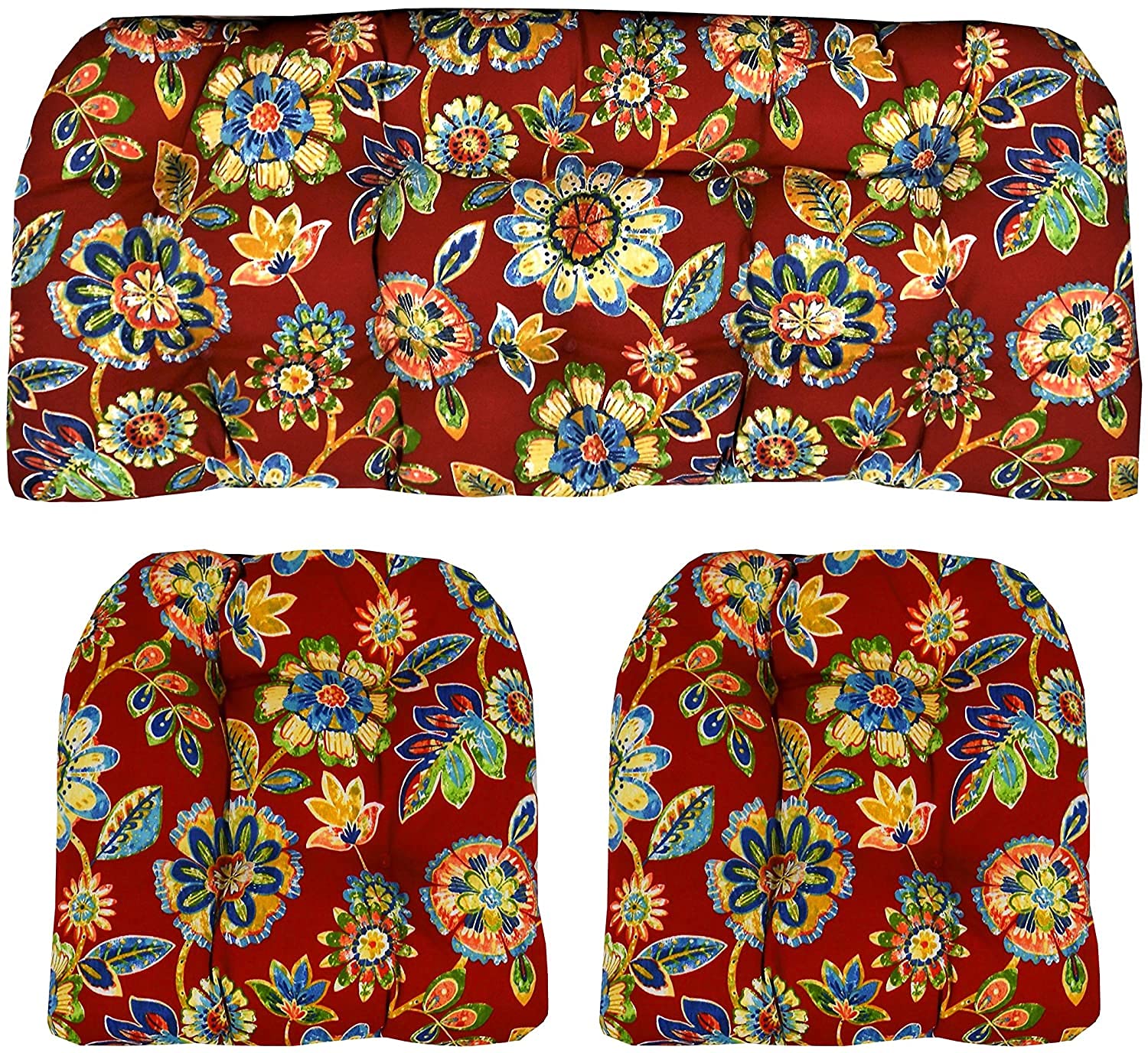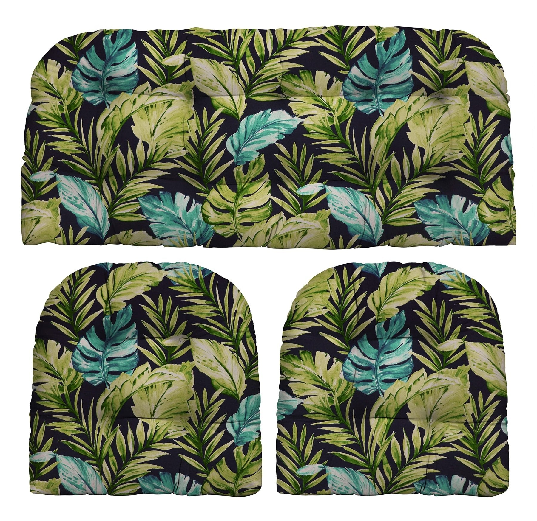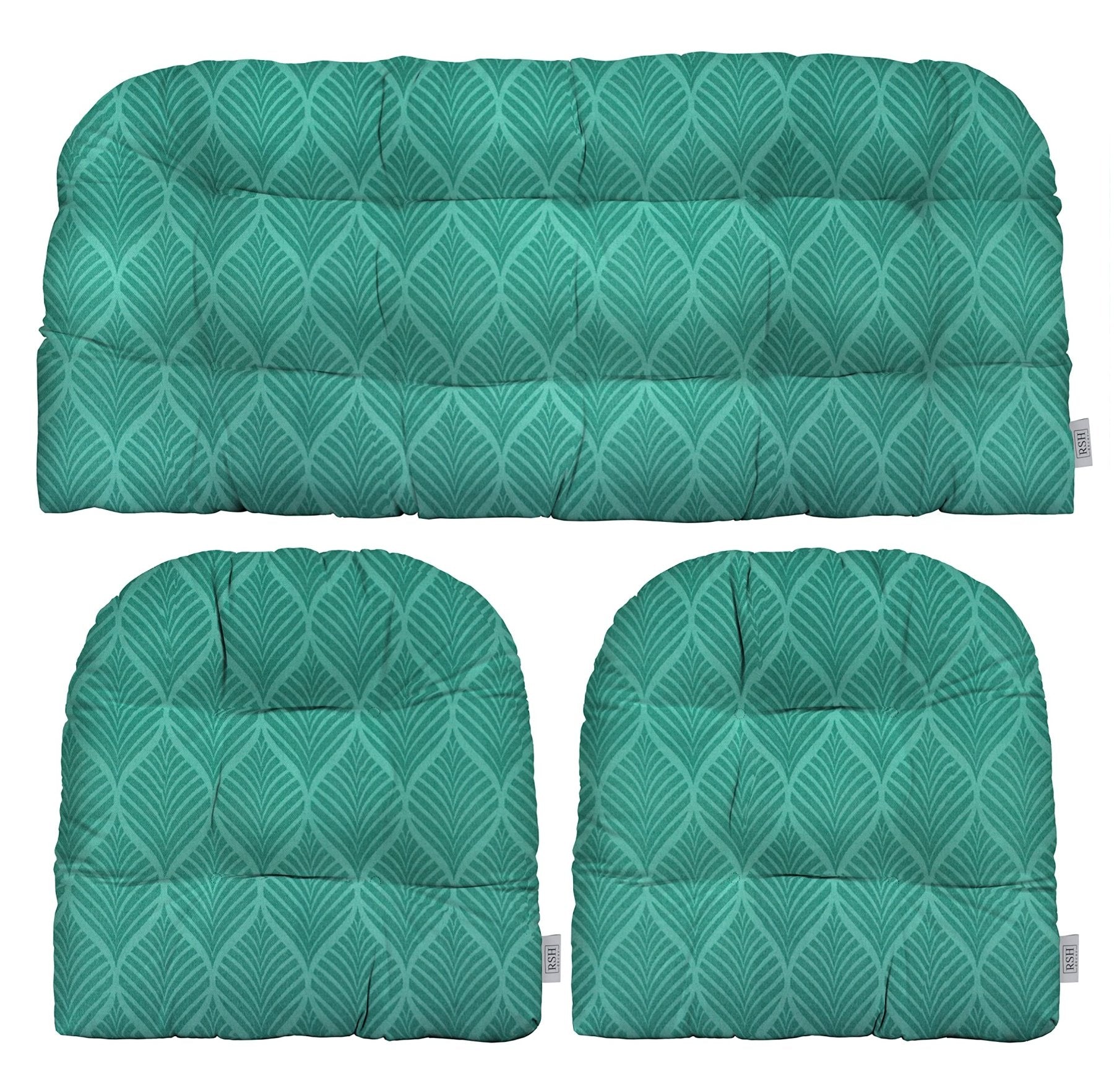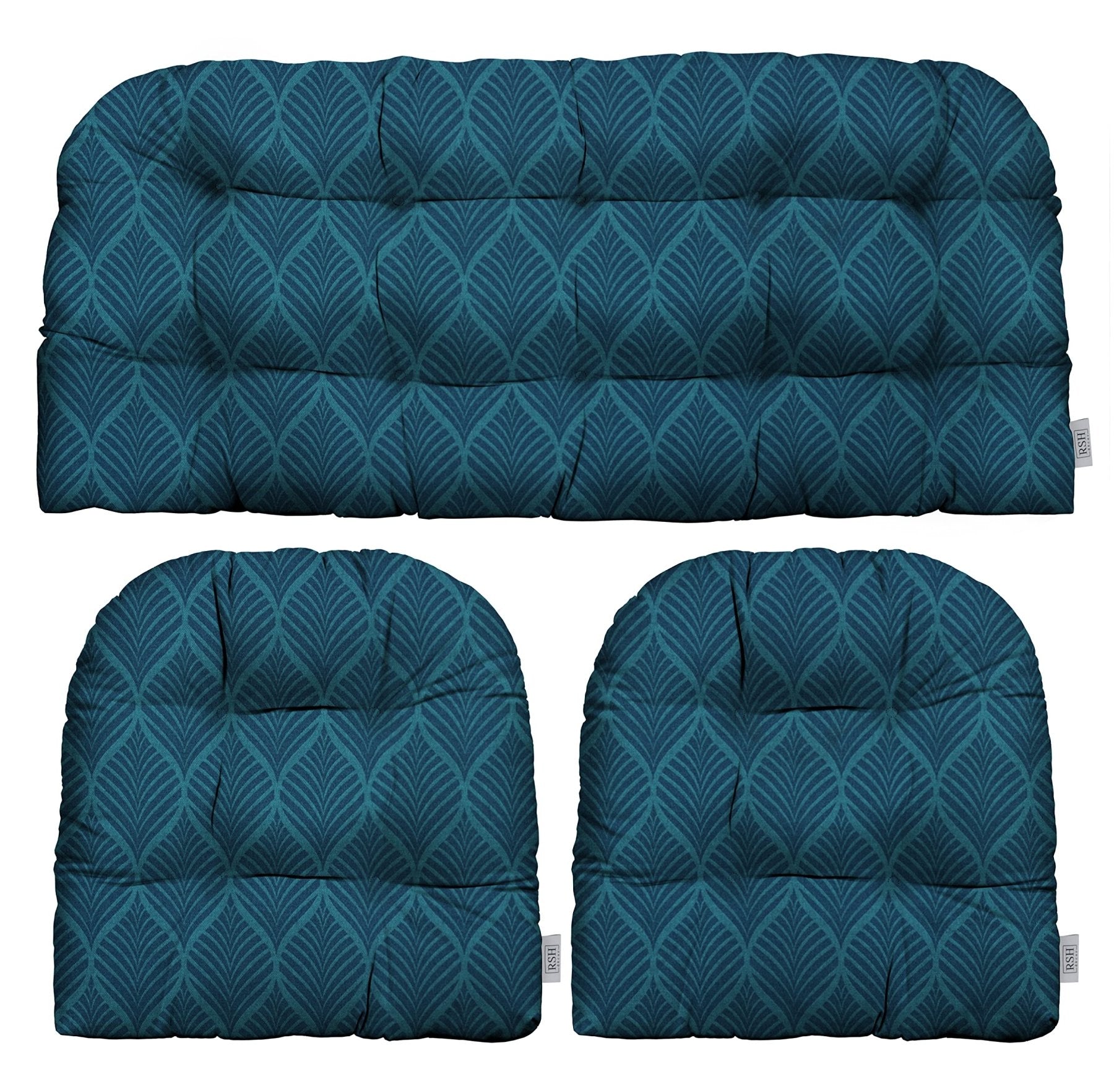 Indoor Outdoor 3 Piece Tufted Wicker Settee and Chair Cushion Set, All Weather, Water & Fade Resistant Polyester Fabric, 1 Loveseat Cushion 44” x 22” & 2 U-Shape Chair Cushions 22”x 22”