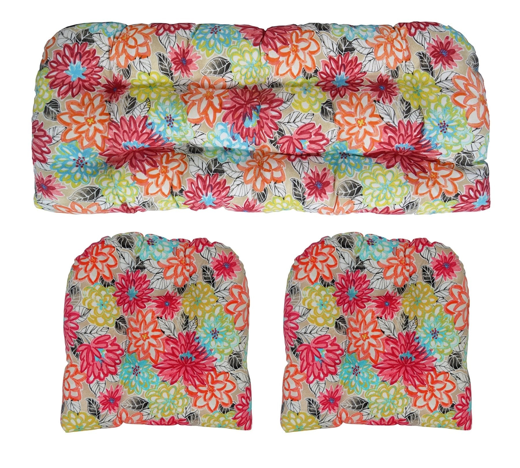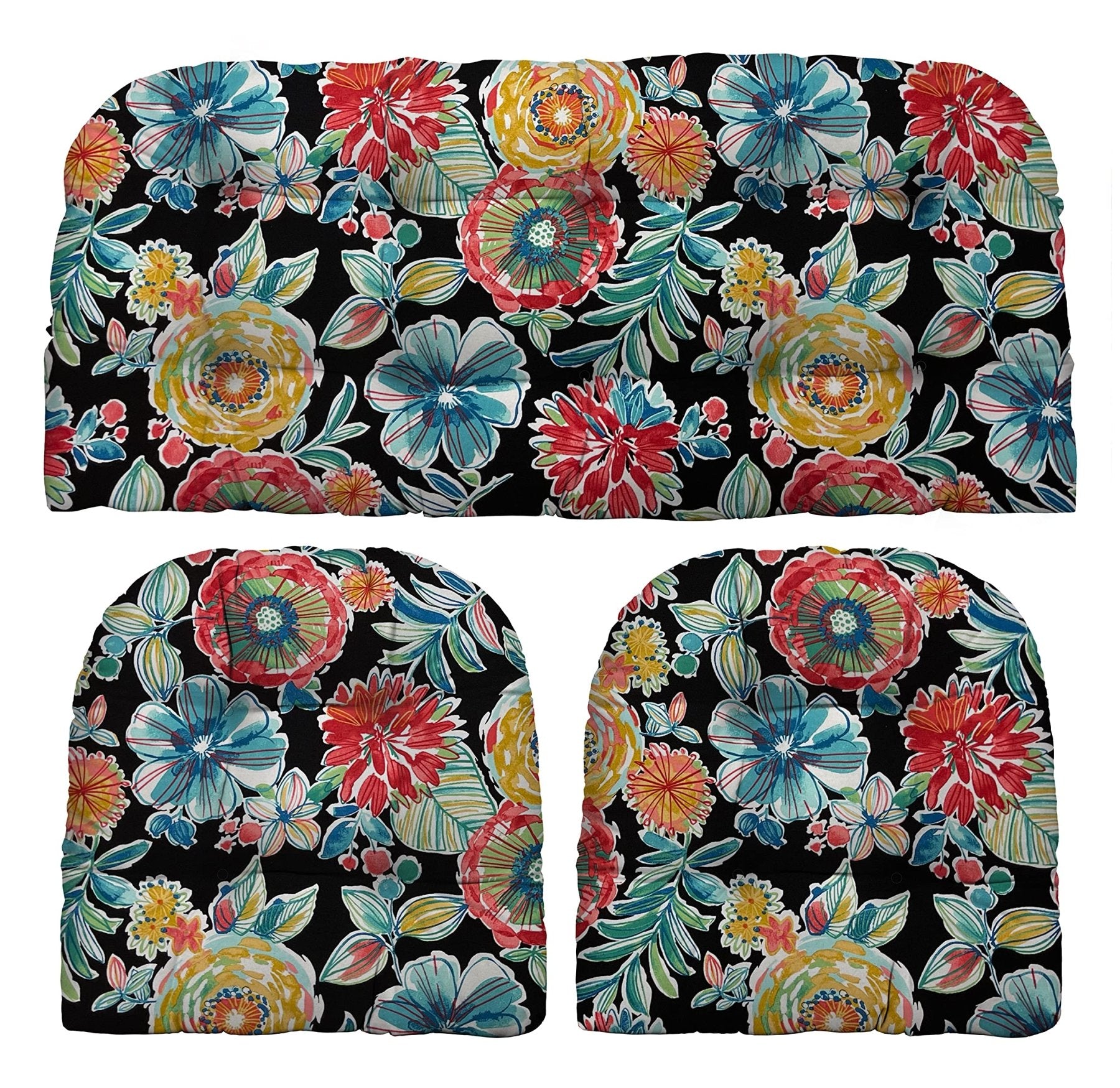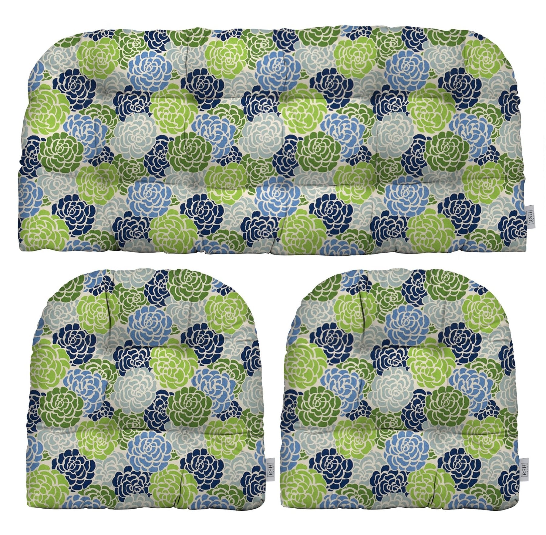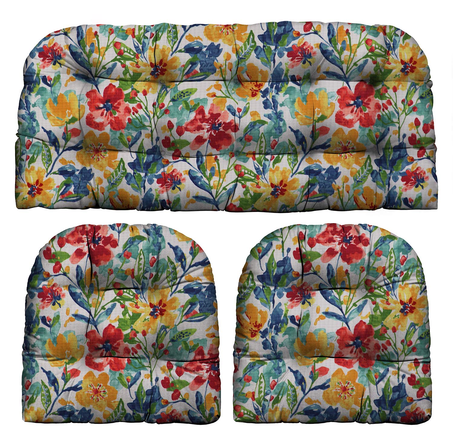 Indoor Outdoor 3 Piece Tufted Wicker Settee and Chair Cushion Set, All Weather, Water & Fade Resistant Polyester Fabric, 1 Loveseat Cushion 44” x 22” & 2 U-Shape Chair Cushions 22”x 22”