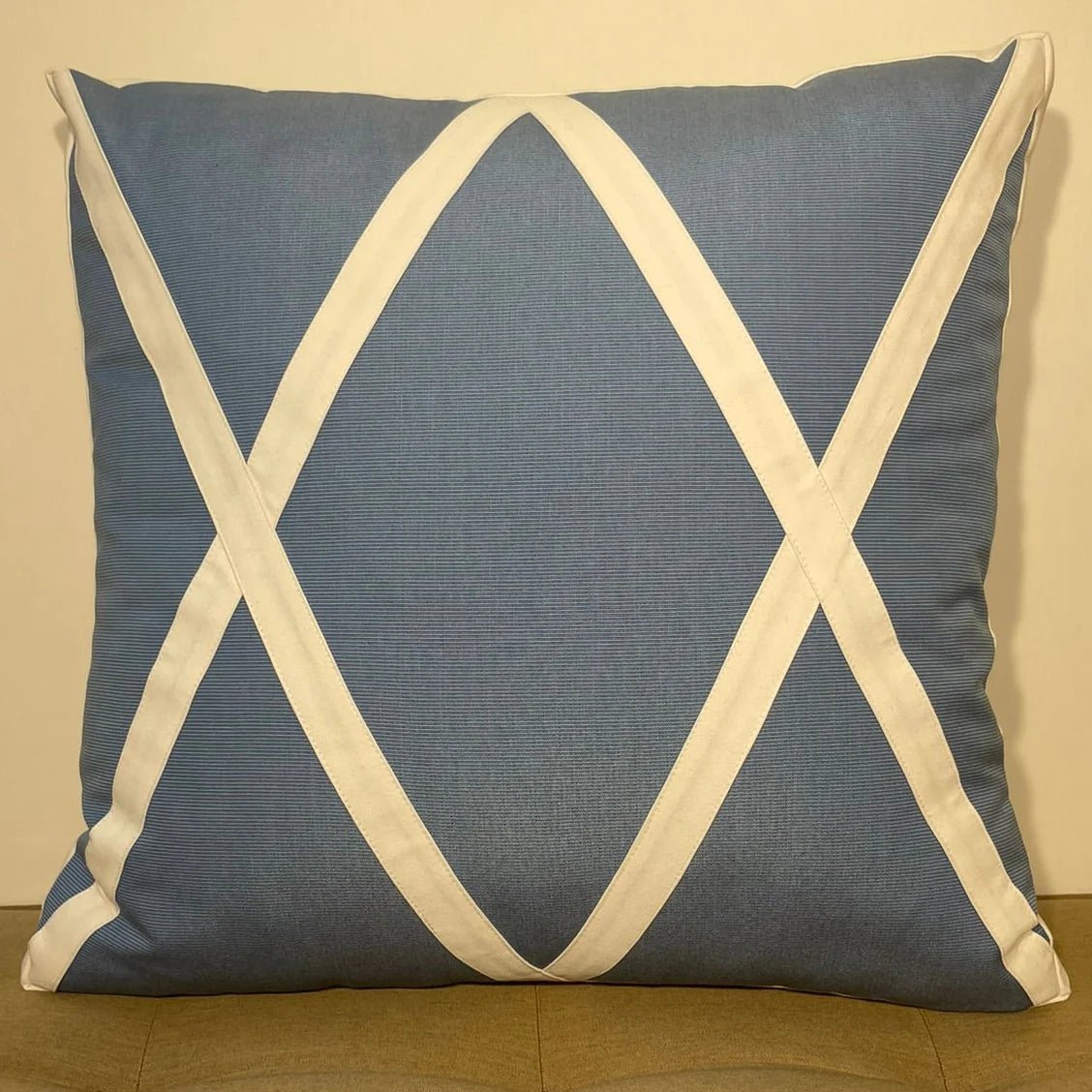Our Trellis Large Pillow is a fun and functional decorative pillow.  It features an Air Blue Background, White trellis 1" wide overlays, with White side panel, and Air Blue backside.