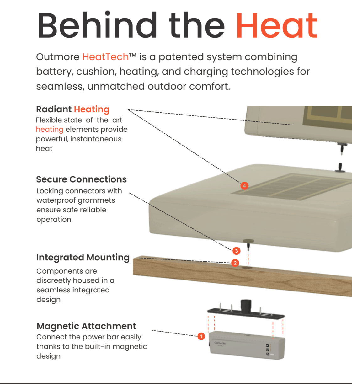 As the only outdoor furniture in the world with patented heated cushions, Outmore HeatTech™ unlocks the potential of outdoor spaces, transforming patios, decks, and yards into year-round outdoor living spaces.