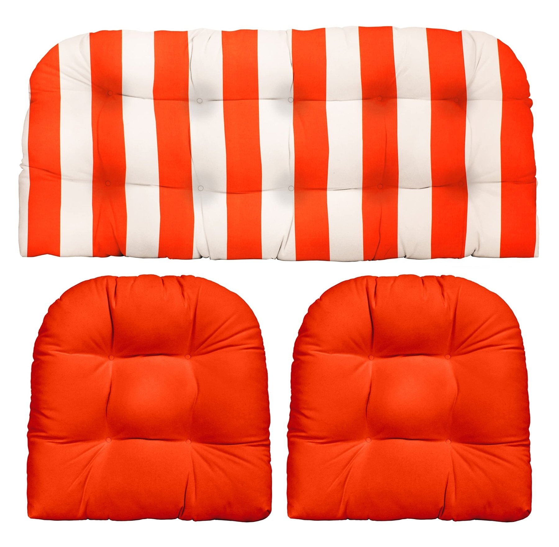 RSH DECOR: 3-Piece Wicker Tufted Cushion Set | 41” x 19" & 19" x 19" | All-Weather Spun Fabric | Water & Fade-Resistant | Outdoor Loveseat & U-Shape Cushions | Coral & White Stripe + Solid Coral