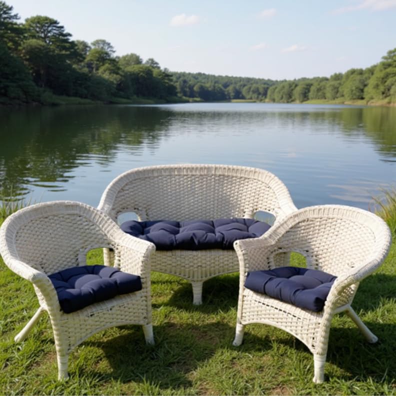 RSH DECOR: 3-Piece Wicker Tufted Cushion Set | 41” x 19" & 19" x 19" | All-Weather Spun Fabric | Water Resistant | Outdoor Loveseat & U-Shape Cushions for Patio Furniture | Navy Blue