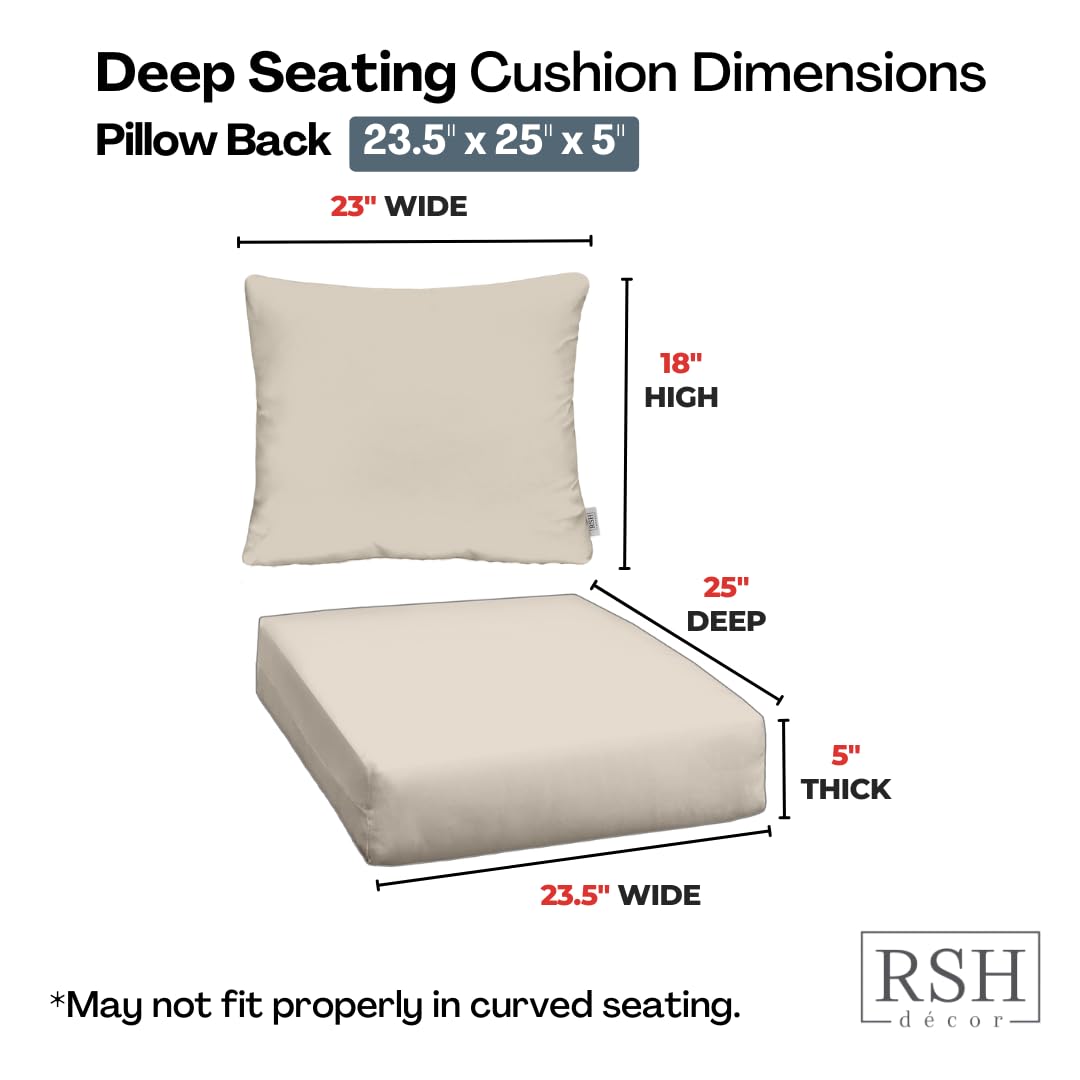Transform your patio into a resort-style retreat with the RSH Décor Deep Seating Pillow Back and Seat Cushion Set, crafted for comfort, durability, and timeless outdoor living. Designed to refresh and upgrade your patio furniture, this set includes one supportive pillow back and one foam-filled seat cushion, creating the perfect balance of plush comfort and long-lasting performance. Whether you're replacing worn outdoor chair cushions or styling a new seating area, this cushion set is the ultimate blend of luxury and function. Each seat cushion is generously filled with 5 inches of high-density foam, offering superior support that won't flatten over time. The coordinating pillow back delivers soft, cloud-like comfort so you can lounge, entertain, or relax with ease. Sized to fit most outdoor furniture frames, this versatile set refreshes your porch, deck, sunroom, or poolside seating with a tailored look. Available in a wide variety of sizes and colors, it pairs effortlessly with any décor style—from modern outdoor patio furniture sets to classic patio décor. Made with durable polyester spun fabric, these cushions are engineered for everyday outdoor living. The fabric resists fading, stains, and UV damage, helping to maintain vibrant color season after season. Quick-drying and water-resistant, this set is designed for all-weather performance—perfect for family gatherings, entertaining guests, or enjoying peaceful mornings outdoors. Enhance your outdoor décor with cushions that are as stylish as they are functional. Choose from a range of sophisticated solids and versatile patterns to elevate your patio furniture set. Every piece is proudly sewn in the USA, reflecting our commitment to American craftsmanship and resort-quality design. Upgrade your seating experience with the RSH Décor Deep Seating Pillow Back and Foam Seat Cushion Set—the perfect combination of style, comfort, and lasting durability for your outdoor living space.