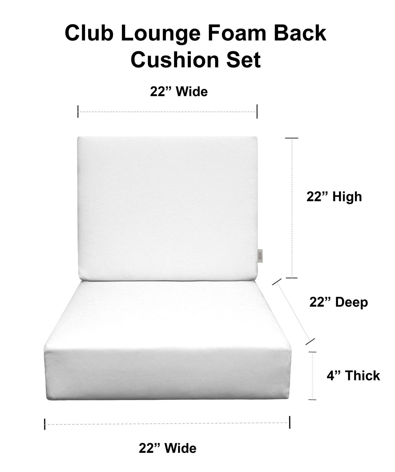 This club lounge cushion is perfect for refreshing your porch or patio and can be used either indoors or outdoors. See schematic for size details. Made of 100% spun polyester, these cushions are water resistant, fade resistant and stain resistant. They are fast drying and easy care; simply sponge wash with soap and water. Made in the USA.