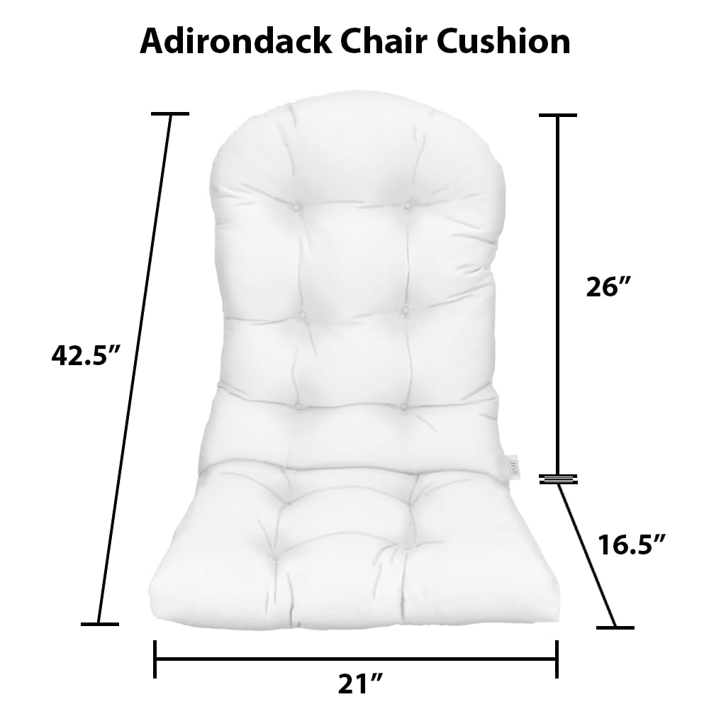 SIZE SPECIFICATIONS – Our Adirondack cushions measure 42.5” H x 21” W. The back is 21" W x 26" H and the seat is 21" W x 16.5" D. To ensure the best fit, measure the inner edges of the Adirondack or rocker for the width, and from the front to the base of the back for length.