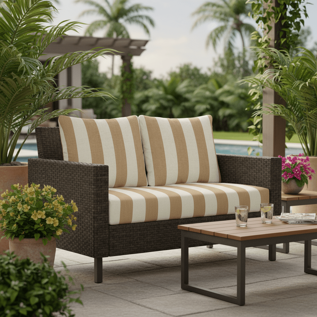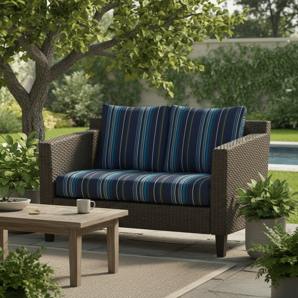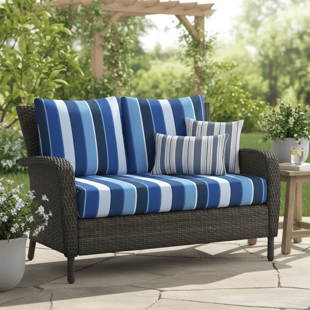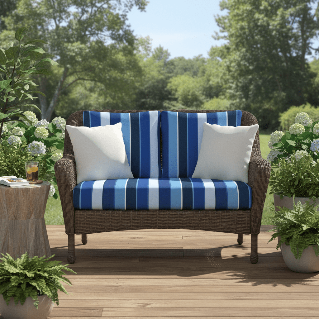 SIZE SPECIFICATIONS: Our loveseat cushion measures 46” W x 26” D x 5" thick and the 2 pillow back cushions are 25" W x 21" H. To ensure the best fit, measure your seat between the arms and from the base of the back to the top of the chair. Subtract 5” from the back measurements to account for the loveseat cushion.