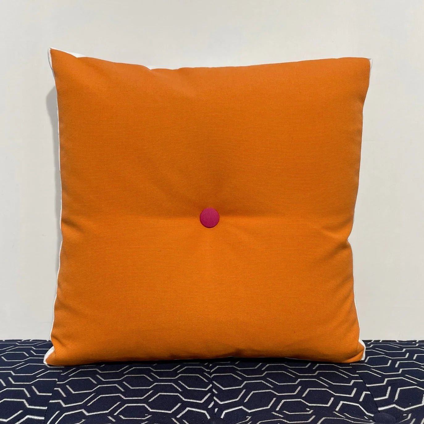 Our Flower Pillow is a fun and functional decorative pillow. It features Hot Pink color Petals, White background and side panel, and Tangerine button and backside.