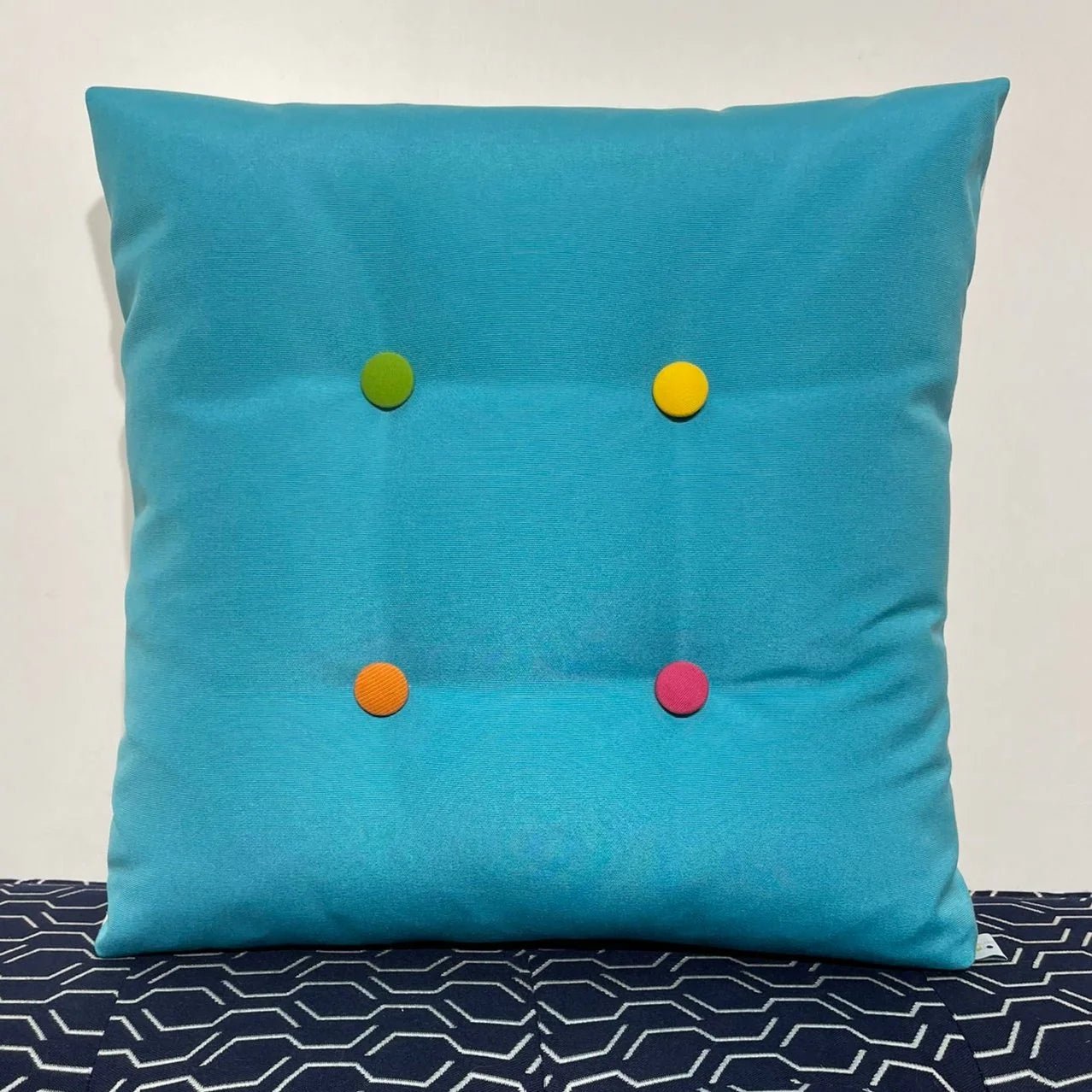 Our Four Button Pillow is a fun and functional decorative pillow. It features a White Front, Aruba Back, and sports a rainbow of covered buttons in Sunflower, Macaw, Hot Pink, Aruba and Tangerine.