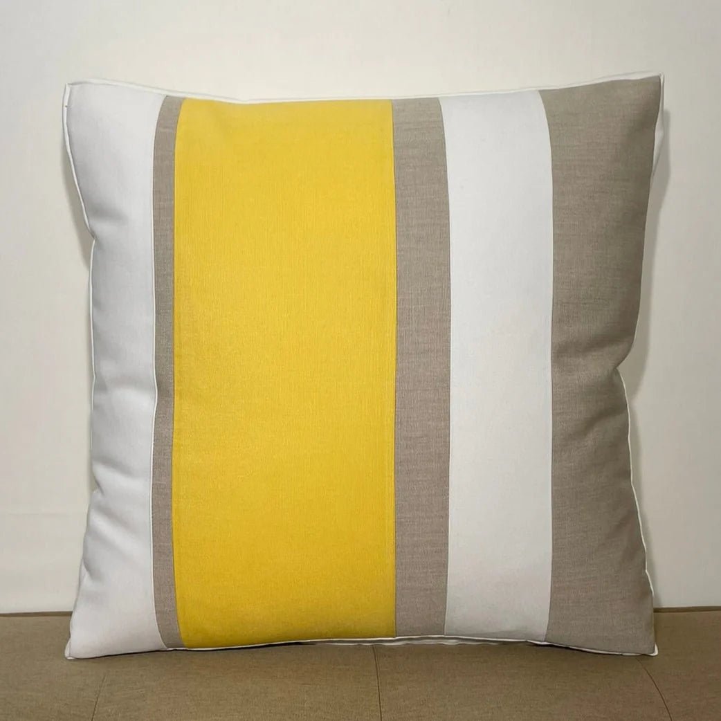 Our Multi Stripe Pillow is a fun and functional decorative pillow. It features a vertical striped front in Buttercup, Flax and White, with a White side panel and Buttercup backside.