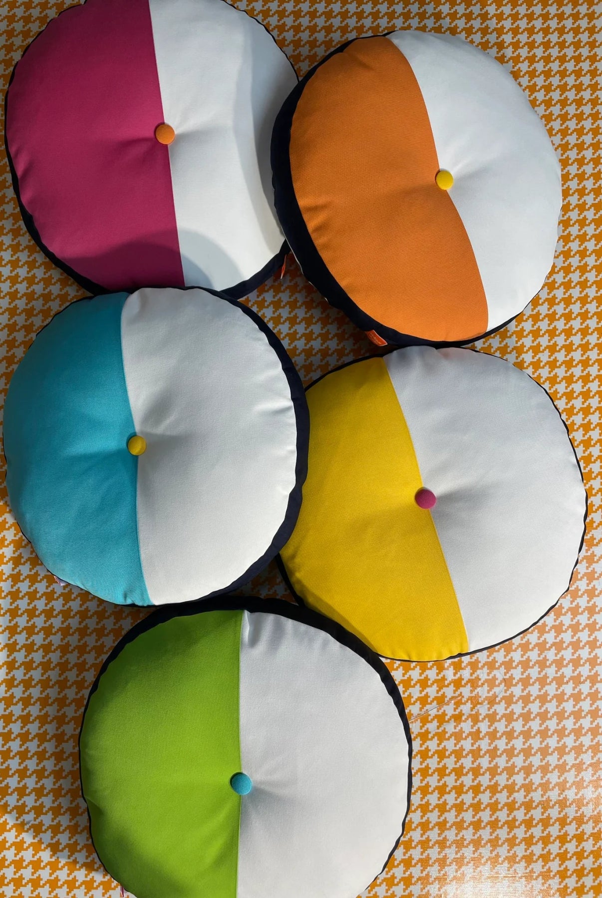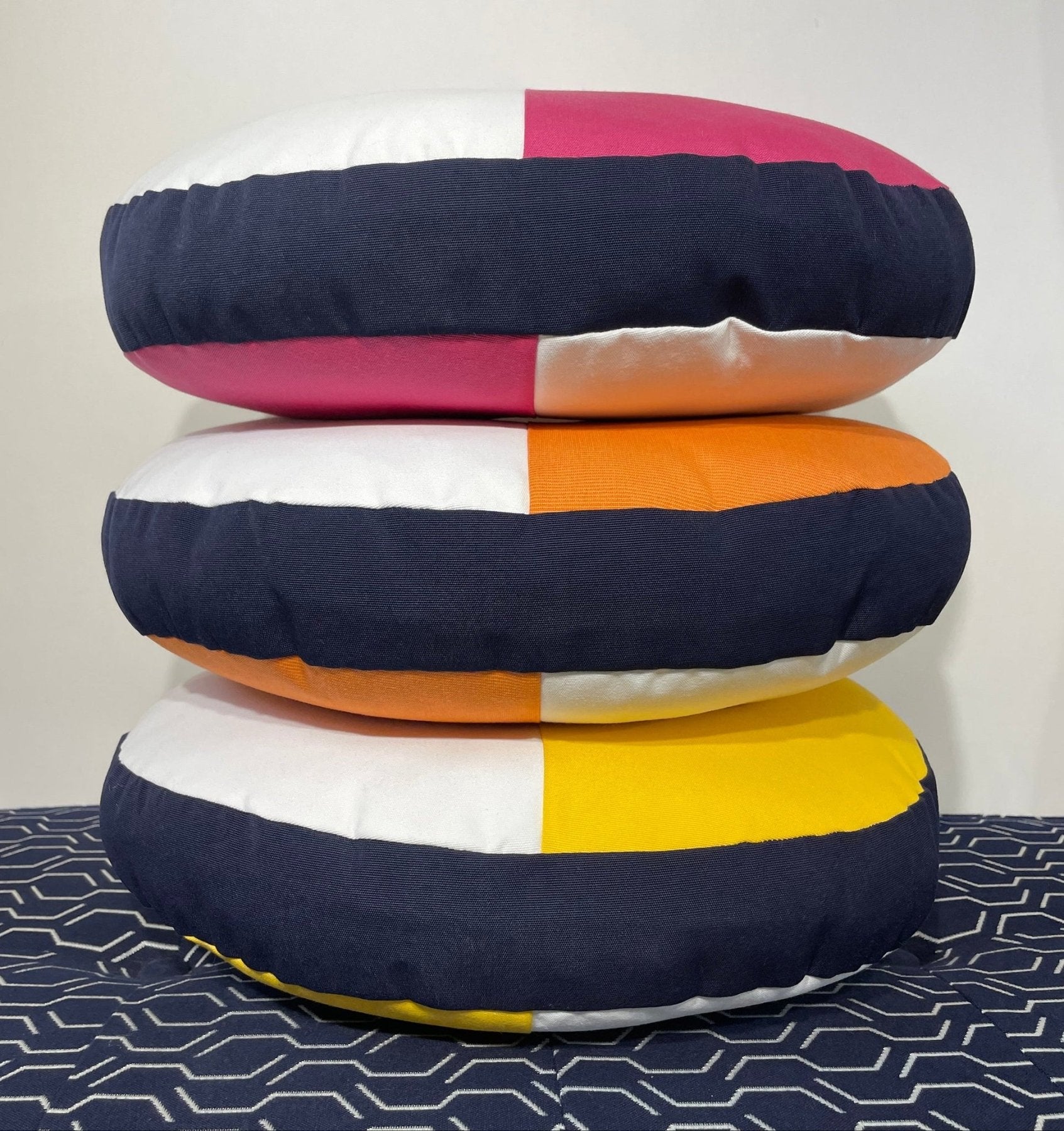 Our Splits Circle Pillow is a fun and functional decorative pillow. It features a split front and back in Macaw and White with Navy side panel and Aruba fabric covered buttons.
