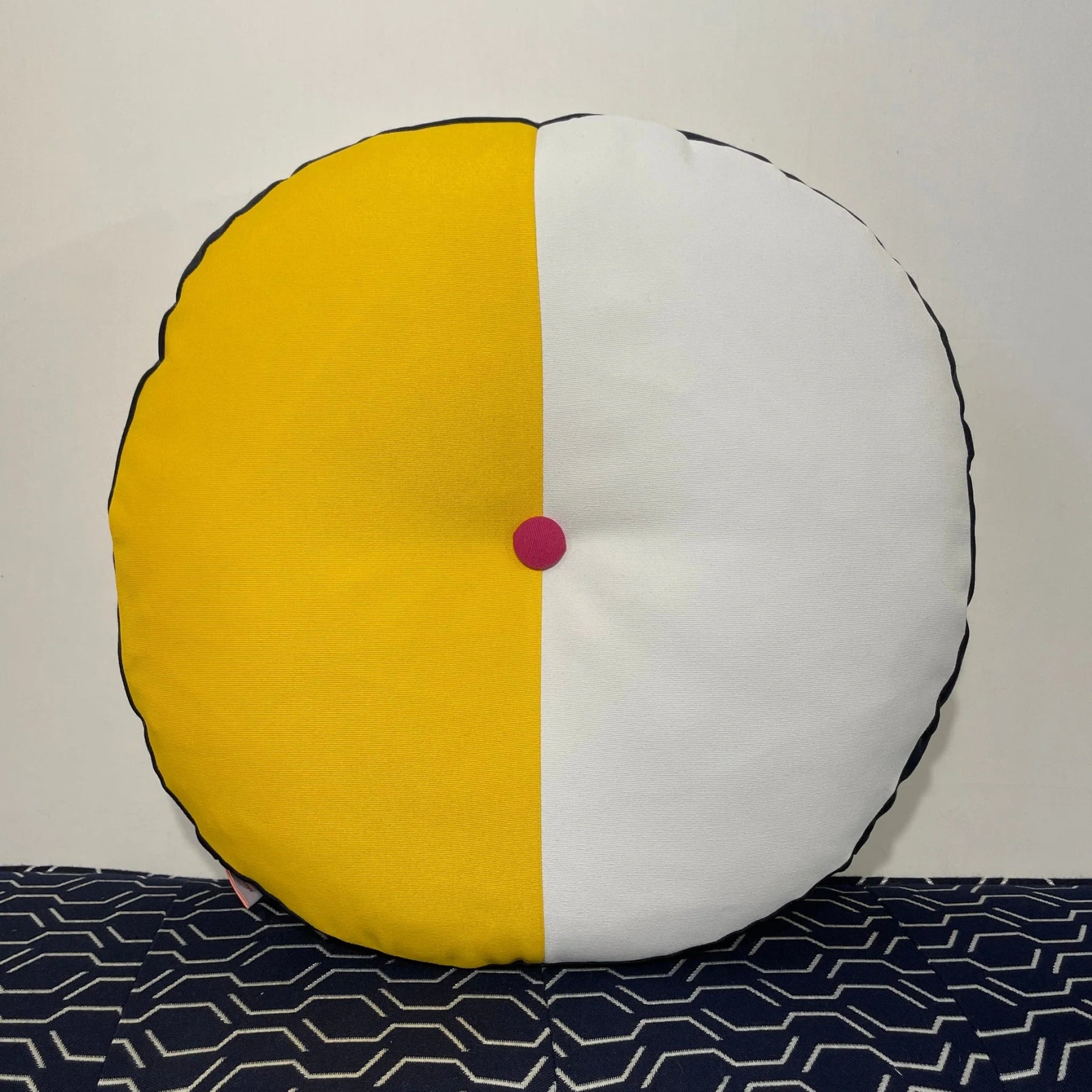 Our Splits Circle Pillow is a fun and functional decorative pillow. It features a split front and back in Sunflower and White with Navy side panel and Hot Pink fabric covered buttons.