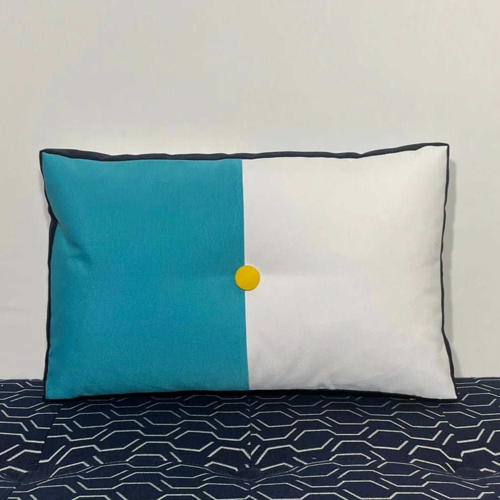 Our Splits Lumbar Pillow is a fun and functional decorative pillow. It features a split front and back in Aruba and White, with Navy side panel and Sunflower fabric covered buttons.
