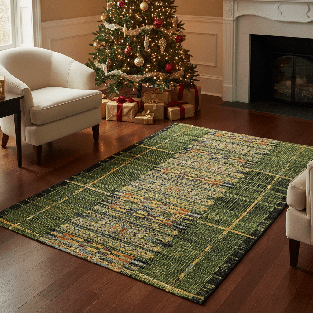 The Tribal Stripe colorful decorative contemporary area rug is inspired by traditional tribal designs that features geometric linear patterns detailed with multiple colors and intricate shapes. The earthy green background serves to highlight the vivid accent colors in gold, orange, blue and black to complement its bold design, making this a truly unique piece for any space inside or outside your home.