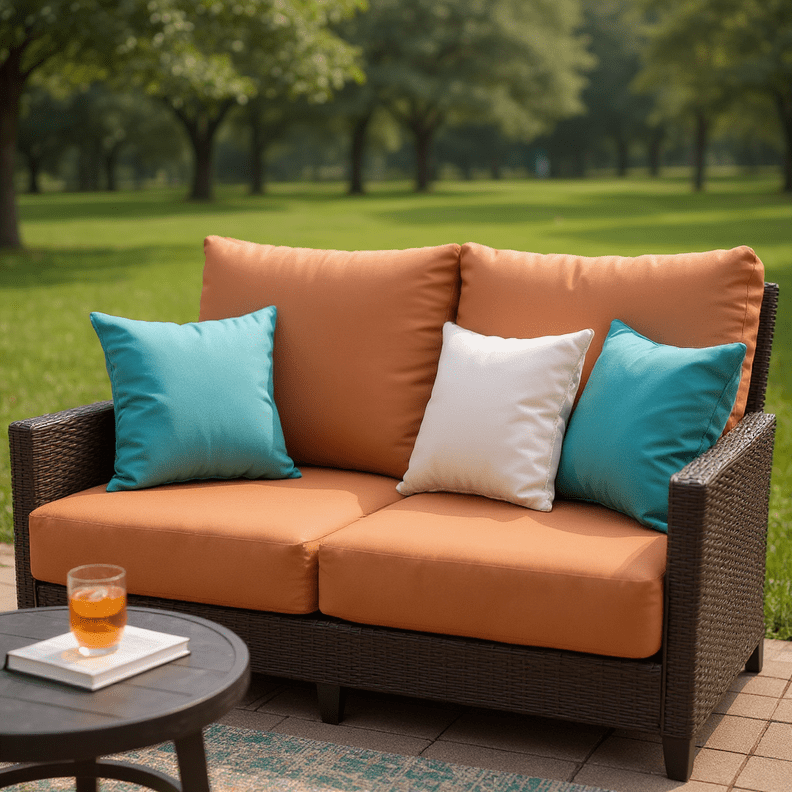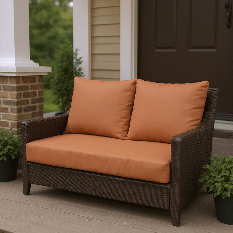 SIZE SPECIFICATIONS: Our loveseat cushion measures 46” W x 26” D x 5" thick and the 2 pillow back cushions are 25" W x 21" H. To ensure the best fit, measure your seat between the arms and from the base of the back to the top of the chair. Subtract 5” from the back measurements to account for the loveseat cushion.