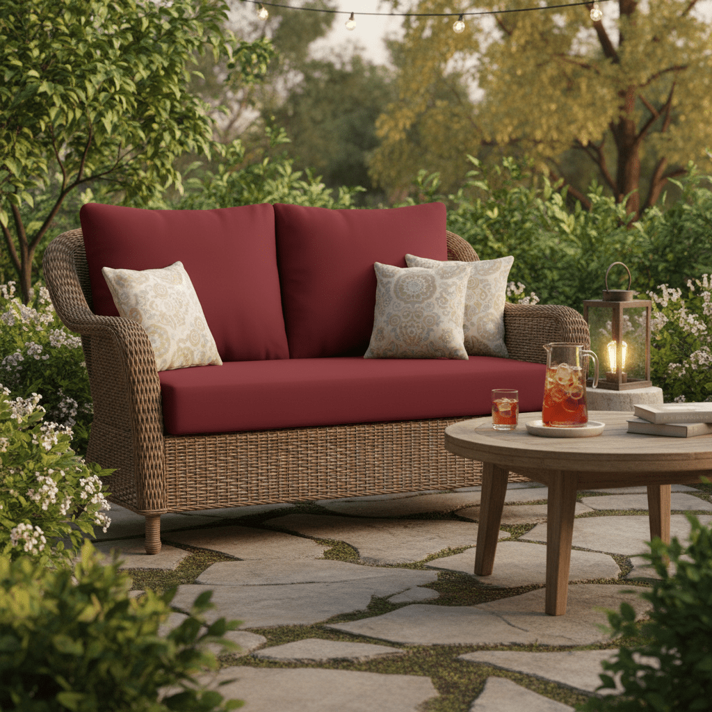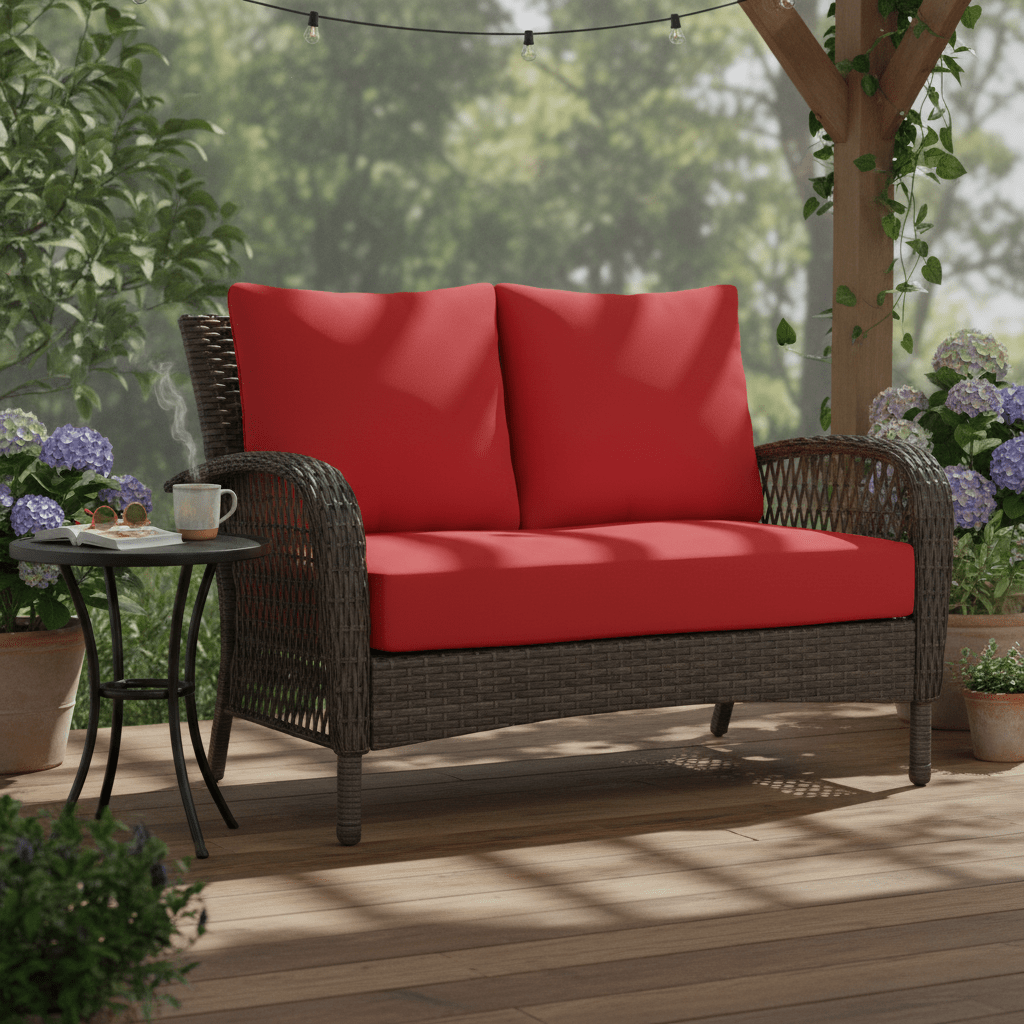 SIZE SPECIFICATIONS: Our loveseat cushion measures 46” W x 26” D x 5" thick and the 2 pillow back cushions are 25" W x 21" H. To ensure the best fit, measure your seat between the arms and from the base of the back to the top of the chair. Subtract 5” from the back measurements to account for the loveseat cushion.