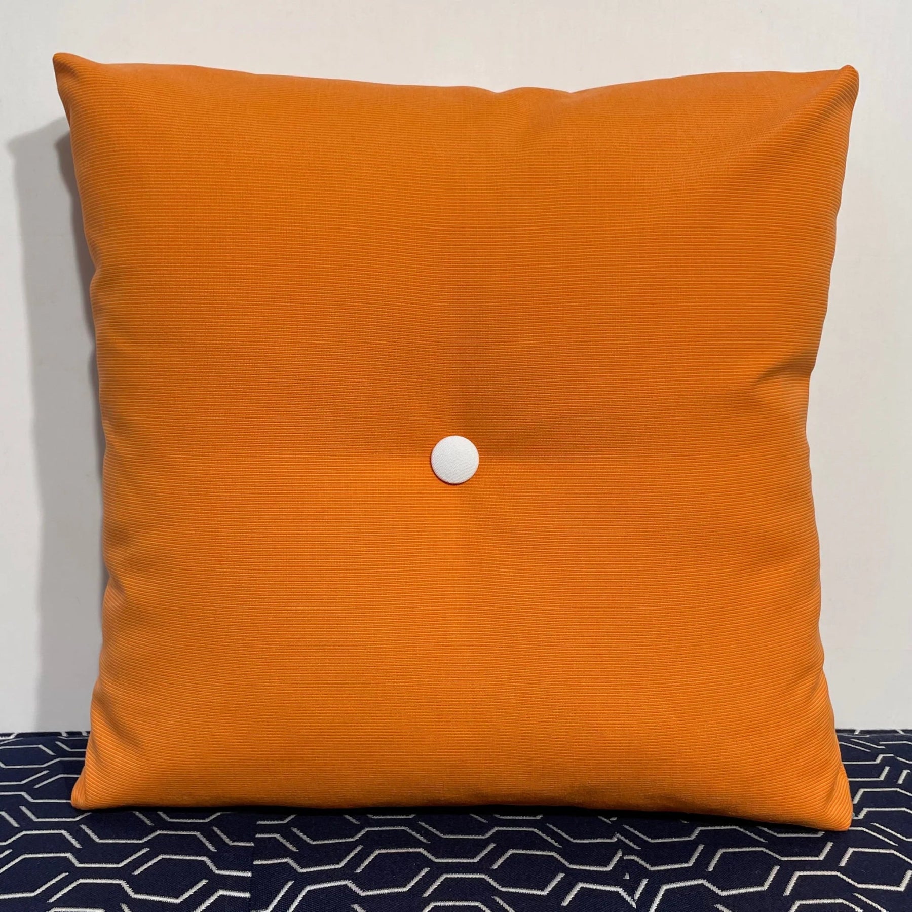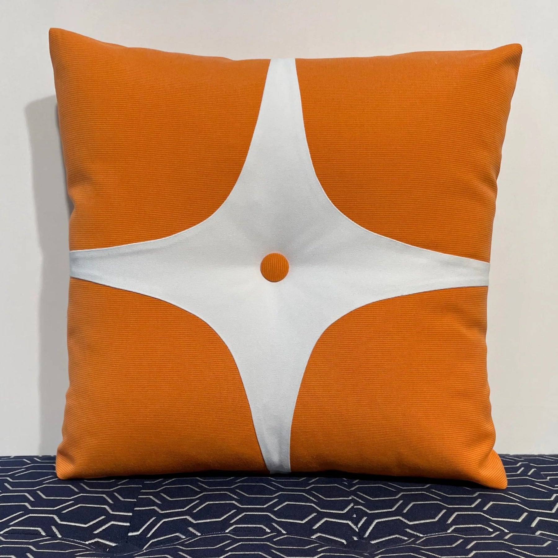Our Astro Pillow is a fun and functional decorative pillow. It features a Tangerine and White Front, Tangerine Back, Tangerine and White covered buttons.