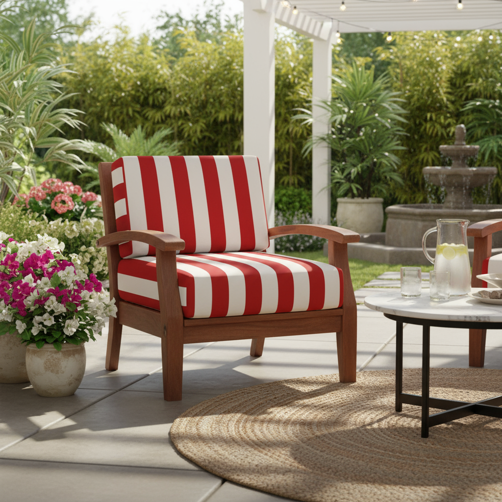 Club Lounge Chair Deep Seat Red and White Stripe Cushion With Low Foam Back
